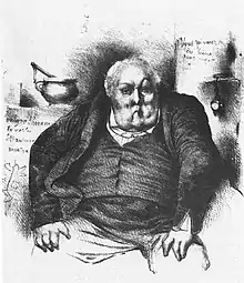 Given the standings of the two men, the painting was received in both social and political terms. A number of writers mentioned Bertin's eventful career, in tones that were, according to art historian Andrew Carrington Shelton, either "bitingly sarcastic [or] fawningly reverential".[38] There were many satirical reproductions and pointed editorials in the following years. Aware of Bertin's support of the July Monarchy, writers at the La Gazette de France viewed the portrait as the epitome of the "opportunism and cynicism" of the new regime. Their anonymous critic excitedly wondered "what bitter irony it expresses, what hardened skepticism, sarcasm and ... pronounced cynicism".[42]