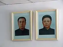 At the end of the decade, North Koreans were told to hang portraits of Kim Jong Il next to their portraits of Kim Il Sung.[3] The regulation was put in place relatively late into Kim Jong Il's cult of personality.[4] The reason was that he had little, and by 1980 virtually no, competition as the heir apparent.[5] The order to do so became unofficially so that North Korean propaganda could claim that there was a spontaneous movement that supported Kim Jong Il. By around 1980, every office and home had the two portraits on display.[6] In the 1980s, the rules on portraits were extended yet again to cover rail and subway carriages. Buses and trams were excluded for unknown reasons.[3] Since the early 1990s, Kim Jong Il portraits have been the same size as those depicting Kim Il Sung, and their display has been standardized so that they are always displayed side by side.[2] In the 1990s, a third kind of portrait was added that depicts Kim Jong Il and Kim Il Sung engaged in discussion about state management. High-ranking officials were given yet another portrait, that of Kim Il Sung's first wife and mother of Kim Jong Il, Kim Jong-suk. Offices, however, do not display this picture.[3] In recent years, the portraits' societal importance has waned.[7]