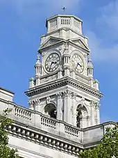 The external design involved a main frontage with 17 bays separated by Corinthian order columns and a large portico with a pediment above.[1] The pediment was designed by the sculptor, Henry Thomas Margetson, and was intended to depict "Britannia receiving the trades of the world".[4] Above the crown of the pediment a statue of Neptune sitting a chariot pulled by three seahorses was installed.[1] At roof level a three-tier bell tower with clocks on each face was erected.[1] Internally, the principal rooms were the main concert hall, the council chamber and a room now known as the "star chamber": the latter room now displays a huge mural known as "Heaven's Light Our Guide" which depicts local scenes.[5] The design is a slightly more elaborate version of his 1873-completed commission for Bolton Town Hall.[6]
