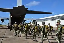 Paratroopers after conducting a high altitude low opening (HALO) jump in multinational airborne training (2018)