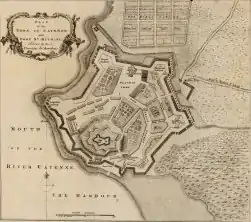 The town of Cayenne is situated on an island in the mouth of the Cayenne and Mahury Rivers. In 1809, its approaches were protected by a series of forts and gun batteries, while the town itself was dominated by a modern star fort.[11] Acknowledging that his force was not large enough to invade the island directly, Yeo decided instead to attack a series of outlying forts on the Mahury River in an effort to draw out the French defenders.[11] On 6 January 1809, preparations were complete and Yeo launched an attack during the night, landing at Pointe Mahury at 03:00 on 7 January in five canoes despite heavy rains, which continued throughout the campaign. The surf was strong and all five canoes were wrecked on the beach, but there were no casualties. Yeo detached a Portuguese force under Major Joaquim Manuel Pinto against the Dégras de Cannes battery while he advanced on Fort Diamant with a force of seamen and marines. Both positions were rapidly carried, the British suffering seven men wounded to French losses of six killed and four wounded. Four cannons were seized, as were 90 French soldiers. Both fortifications were then garrisoned with soldiers from the squadron.[12]