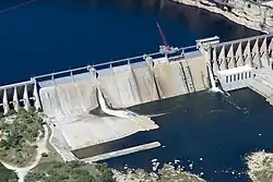 The lake is impounded by the Morris Sheppard Dam, which was a project of the Brazos River Authority and the Works Progress Administration. Construction was begun in 1936 and completed in 1941. The dam is 2,700 feet (820 m) long and 190 feet (58 m) high.[3] The construction is unique with buttressed arched wings on either side of the nine spillway gates rather than the usual filled concrete.[4] It has two 11,250 kilowatt generators which were used during peak demand periods that are no longer in use.[5] Morris Sheppard was in 1938 one of Texas' United States Senators. The dam was named for him in honor of his efforts in obtaining funding for the project.[6]