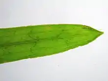 Potamogeton compressus produces a strongly flattened, robust, branching stem up to 90 cm in maximum length.[4] It grows annually from turions and seed, producing bushy plants branching near the surface with long, rather grass-like leaves that are 85–240 mm long and 3–6 mm wide and olive-green or dark green, sometimes with a reddish tinge near the surface.[4] Each leaf has two veins either side of the midrib and is bluntly pointed. The leaves have a rather opaque appearance compared to the transparent leaves of most pondweeds due to the presence of fibres called sclerenchymatous strands. There are no rhizomes or floating leaves.