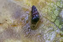 This species is approximately 3 mm in length and just over 1 mm in width.[4] The shell is light brown in colour and semi transparent. The colour of the mantle can be patchy and there are two black stripes on the head of the snail.[3]
