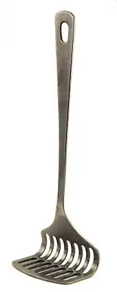A potato masher, tater masher, bean masher, pea masher, masher, or crusher is a food preparation utensil used to crush soft food for such dishes as mashed potatoes,[1][2] apple sauce, or refried beans. Potatoes mashed using a potato masher tend to be fluffier and lighter in texture compared to other methods of mashing, because use of the device reduces cell damage to the potato, releasing less starch.[3]