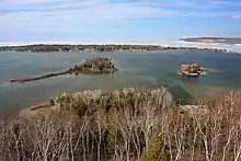 View in August from the now-closed tower. Sawyer Harbor is in the foreground, with the western part of Sturgeon Bay in the background. The small island at right is Heaven On Earth Island, formerly Bug Island. The larger island to the left is Idyll Wood Island. Cabot Point is behind the two islands. It is part of the Idlewild area. In the far distance at center-right is the rock cut of the Old Stone Quarry on the northwest shore of Sturgeon Bay, once the largest in the state.