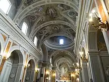 The ceilings and the apse have an elaborate program of frescoes painted in the 20th century. The ceiling was painted (1933-1934) from the façade to the presbytery with scenes from the old to new testament by the painter Mario Prayer. The bronze doors (1968) were created by Giuseppe Niglia. Below the main altar is a crypt with archeologic evidence of prior structures in a mosaic pavement. The dome has frescoes depicting a procession of St Gerard. The apse has a Christ the Redeemer frescoed against a bright background. The chapel of St Gerard has a 15th-century reliquary statue.[1]