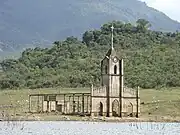 After 26 years under water,[5] there was a 98 feet (30 m) drop in the water level of the reservoir[2] due to a drought.[1][5] The church, grave markers, the ruins of houses and the outline of the former town square have reemerged[1][4] with the church entirely exposed,[4] although only its facade remains.[5] Some visitors have appeared as well, including Garcia who once worked at the church there who commented, "It brings me joy, but it also makes me sad to see the situation that we're in."[5] The 2009-10 El Niño event is believed to be responsible for the severe drought afflicting the region.[1][2][4][5]