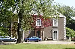 Poulton Hall has been the home of the Poulton Lancelyn family since the 12th century.[1] In the 16th century their surname became Lancelyn Green (or Greene) when Elizabeth Lancelyn married Randle Greene of Congleton.[2] It has been alleged that a castle existed on the site, but there is now no reliable evidence of earthworks or a castle.[1] The present hall dates from 1653, and it was extended to the rear in 1720 when Revd Robert Green added a library. In 1840 a larger addition was made, consisting of a dining room and service wing, and a billiard room containing a pipe organ was built to the left of this in the 1880s.[2]