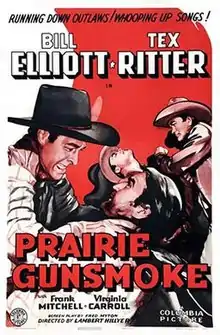 Prairie Gunsmoke is a 1942 American Western film directed by Lambert Hillyer and written by Fred Myton. The film stars Wild Bill Elliott, Tex Ritter, Frank Mitchell, Virginia Carroll, Hal Price and Tris Coffin. The film was released on July 16, 1942, by Columbia Pictures.[1][2][3]