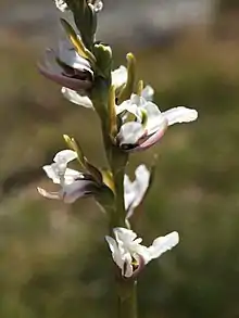 Prasophyllum alpestre is a terrestrial, perennial, deciduous, herb with an underground tuber and a single tube-shaped leaf, 150–350 mm (6–10 in) long and 4–8 mm (0.2–0.3 in) wide. Between five and twenty five fragrant flowers are crowded along a flowering spike about 300–800 mm (10–30 in) long. The flowers are white, purplish and green and 10–15 mm (0.4–0.6 in) wide. As with others in the genus, the flowers are inverted so that the labellum is above the column rather than below it. The dorsal sepal is a narrow egg-shape to lance-shape, 7–10 mm (0.3–0.4 in) long and 3–5 mm (0.1–0.2 in) wide. The lateral sepals are up to 7–10 mm (0.3–0.4 in) long and usually joined to each other. The petals are linear, egg-shaped or spoon-shaped, 8–12 mm (0.3–0.5 in) long, 2–3 mm (0.08–0.1 in) wide and spread widely. The labellum is egg-shaped to oblong, 6–11 mm (0.2–0.4 in) long, turns upwards at about 60° and its edges are wavy. Flowering occurs from November to March, making it one of the last of its genus to flower.[2][3][4]