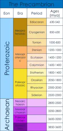 The Precambrian dates from the beginning of Earth's formation (4.6 billion years ago) to the beginning of the Cambrian Period, 539 million years ago.[1][2] The Precambrian consists of the Hadean, Archaean and Proterozoic eons.[1] Specifically, this article examines the Ediacaran, when the first multicellular bodies are believed to have arisen, as well as what caused the rise of multicellularity.[3] This time period arose after the Snowball Earth of the mid Neoproterozoic. The "Snowball Earth" was a period of worldwide glaciation, which is believed to have served as a population bottleneck for the subsequent evolution of multicellular organisms.[4]