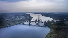 The Preobrazhensky Bridge is a two bridge crossing over the Dnipro River in the city of Zaporizhzhia, Ukraine. Construction on the bridges began in the spring of 1949 and was completed in 1952. The official opening took place on December 31, 1952.[1] Due to the lack of high-tech steel in the early post-war years, the bridges were built from reinforced concrete. The bridges are named after the engineer Borys Preobrazhenskyi. The railway and highway which run over the bridge connect the Khortytskyi District with the Zaporizhzhia city center.[2]