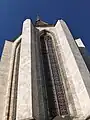 In spite of numerous rebuildings of the church, convent buildings and the cloister, the exterior of the church is preserved in the early Gothic style. Lanced windows have the typical Gothic tracery- circled three-leaves, divided into two parts which are ended by rosettes. Massive supporting columns with no decoration ended in the isosceles triangle protrude to the exterior. The eastern frontage and the lanced niche with smaller window are the part of town fortifications. Seven former decorative niches, typical for the early Gothic churches are maintained on the peak.