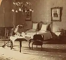 The dressing room in the southwest corner of the suite has historically served as the First Lady's dressing room, study, or bedroom and has a walk-in closet and bathroom.[2] The suite is also served by a walk-through closet leading to the bedroom, which also has a large bathroom.[3] The room currently used as a living room, immediately west of the Yellow Oval Room, was historically used as the president's private bedroom until the 1970s.[4]