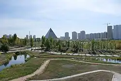 The Presidential Park (Kazakh: Президенттік саябақ, Prezidenttık saiabaq) is one of the largest urban parks in Astana. Built in 2008 at the 10th anniversary of the Capital City Day, it is located right behind the Ak Orda Presidential Palace and across the Ishim river. It is the site of the Palace of Peace and Reconciliation with flower beds and trees occupying most of the territory. From the north side the park is bordered by Baitursynov Street and from the south by Najimedenov Street.[1] The park is surrounded by multi-story residential buildings and it's artificial stream with fountains is shaped as the Simurgh, a bird symbol of Kazakhstan's independence.[2]