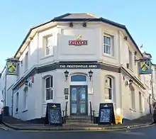 The earliest streets developed north of Old Shoreham Road were the northern section of Prestonville Road, Prestonville Terrace,[note 3] Hamilton Road (on which stands the Prestonville Arms pub),[13] Hamilton Terrace, Brigden Street and the lower section of Stanford Road, all of which date from between 1865 and 1869. York Grove, built on the site of the New England Farm buildings, predated these streets by about five years.[12] (The main farmhouse, built before 1820 in a Classical style with a prominent Doric-columned porch, was retained and is numbered as 26 York Grove.)[13] Ribbon development spread north along Dyke Road during the 1870s, reaching Highcroft Villas which was itself built up from 1880. The 1880s was a period of major development in Prestonville, as the land around an 18th-century house called Port Hall was developed with housing. Coventry Street, Exeter Street, Port Hall Street, Upper Hamilton Road and the northern part of Stanford Road date from this time. Four more roads—Buxton, Chatsworth, Lancaster and Stafford—were built during the 1890s.[12][13] Further north, the roads bounded by Dyke Road, Highcroft Villas, The Drove and the railway line date from the last five years of the 19th century, and the area northwards towards Tivoli Crescent North was completed by the start of World War I.[12] Millers Road, one of the roads from this era, was named after the former Preston Mill, as was the Dyke Tavern pub on Dyke Road (originally the Windmill Inn).[3]