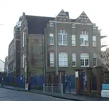 Prestonville has two educational buildings of architectural interest. The Grade II-listed Stanford Road School, a primary school which was built in 1893 as one of "a distinguished group of board schools"[40] designed by Thomas Simpson and his son Gilbert Murray Simpson for the Brighton and Preston School Board. The exterior is lavish, featuring brown and red brick, stone, tile and render, elaborate arched windows, many gables, a clock tower and a wooden bell-cot; and the interior "retains its original plan and detailed features".[41][42] At the corner of Old Shoreham Road and Dyke Road is the Brighton Hove & Sussex Sixth Form College (BHASVIC), which is on Brighton and Hove City Council's register of locally listed buildings. The "splendid"[43] former grammar school was designed by London architect S.B. Russell in 1913, extended in 1934–35 by John Leopold Denman, and made DDA-compliant in 2005 with some "adroitly, boldly handled" access ramps designed by Nick Evans Architects. It is a Neo-Georgian/Queen Anne-style complex with extensive red brickwork and wings joined to a central section by a series of staircases lit by round windows), and occupies a prominent corner site. It retains its original iron gates with the emblems of Hove and Brighton Boroughs and East and West Sussex.[5]