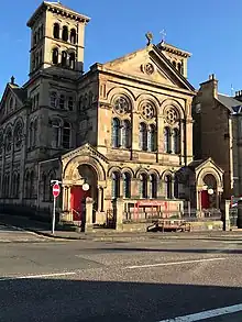 It was designed by James Sutherland and James Campbell Walker, in a distinctive Italianate style. There are twin square campanile towers each over an entrance portal facing onto Dalkeith Road.[3] The style is Lombardic Romanesque, with the main church behind the Dalkeith Road elevation and church hall and vestry forming the rear of the building. A notable feature are the rose stained glass windows."auto The double light windows below these were commissioned as a war memorial in 1921 by Sir John Cowan, in memory of his youngest son, Lt. William Morison Cowan, who died in WW1.[4] They were designed by Alexander Strachan, Douglas Hamilton and Mary Wood. The organ is by James Jepson Binns of Sheffield and dates from around 1900.[2]