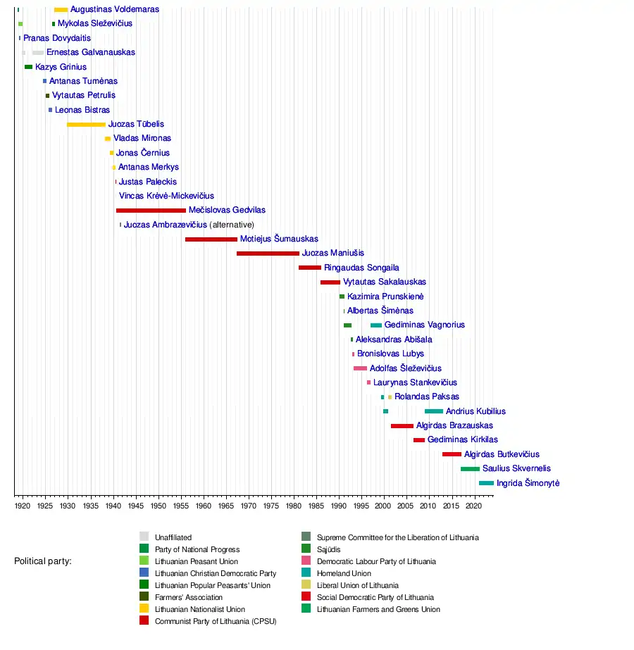 Ingrida ŠimonytėSaulius SkvernelisAlgirdas ButkevičiusGediminas KirkilasAlgirdas BrazauskasAndrius KubiliusRolandas PaksasLaurynas StankevičiusAdolfas ŠleževičiusBronislovas LubysAleksandras AbišalaGediminas VagnoriusAlbertas ŠimėnasKazimira PrunskienėVytautas SakalauskasRingaudas SongailaJuozas ManiušisMotiejus ŠumauskasJuozas AmbrazevičiusMečislovas GedvilasVincas Krėvė-MickevičiusJustas PaleckisAntanas MerkysJonas ČerniusVladas MironasJuozas TūbelisLeonas BistrasVytautas PetrulisAntanas TumėnasKazys GriniusErnestas GalvanauskasPranas DovydaitisMykolas SleževičiusAugustinas Voldemaras