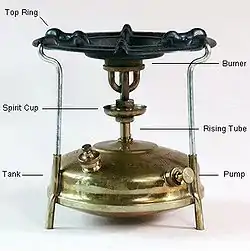 To light the stove, the user pours a small amount of alcohol into a circular "spirit cup" just below the burner and lights it to heat the burner assembly. When it is hot, the user pressurizes the tank by means of a small hand pump integrated into the housing, which forces kerosene from the tank up through the rising tube (A) and the ascending pipe (B) to the pre-heated burner head (C), where the fuel is heated and vaporized. The kerosene vapour is then forced under pressure through the descending tube (D) to the vapor nozzle (E); here it sprays through a jet in the middle of the burner, where it mixes with air and burns in a sootless blue flame. The heat from that flame vaporizes more fuel to sustain the process when the spirit cup burns out. The user can pump the tank more to increase the pressure and make the flame larger; turning a small "air screw" (usually located in the filler cap) will release pressure from the tank and make the flame smaller.[11]