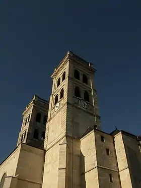In 990 Bishop Haimont ordered the construction of a new cathedral[4] on the Romano-Rhenish plan: a nave, two transepts, two opposing apses, each one flanked by two bell towers. The Holy Roman Emperor Otto III bestowed the title Count on Bishop Haimont (990-1024) and his successors in 997. The bishops had the right to appoint a temporary "count for life" (comte viager), theoretically subject to the authority of the bishop. These counts were selected from the noble family of Ardennes. There was frequent conflict between the count and the bishop.[2]