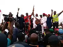 Prince Eze Madumere, leader of All Progressives Congress raising candidate's hand during a rally