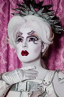 Poppycock "is my mask," says Quale in People Magazine. "Give a man a mask and he will tell you the truth, in the style of Commedia dell'arte."[12] The New York Post noted Poppycock embodies the sensibility of "humor, irony and sarcasm".[13] He wears elaborate costuming and "dresses as if he stepped out of a French Baroque painting (pantaloons, powdered wig and pasty makeup)."[5] His face is matted with whiteface (or white clown) a symbol of the highest status in the clown hierarchy and the oldest of modern clown archetypes.
