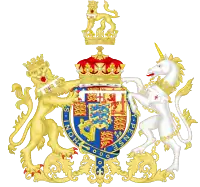 Gloucester bore the royal arms, differenced by an inescutcheon of the Danish coat of arms and a label of three points Argent, the centre point bearing a cross Gules.[70]
