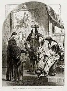 Burnet lectured Gloucester for hours at a time on subjects such as the feudal constitutions of Europe and law before the time of Christianity.[49] Burnet also encouraged Gloucester to memorise facts and dates by heart.[49] Government ministers inspected Gloucester's academic progress every four months, finding themselves "amazed" by his "wonderful memory and good judgement".[49] His childhood troop was disbanded, and King William made him the honorary commander of a real regiment of Dutch footguards.[50] In 1699, he attended the trials in the House of Lords of Lord Mohun and Lord Warwick, who were accused of murder.[30] Mohun was acquitted; Warwick was found guilty of manslaughter but escaped punishment by pleading privilege of peerage.[51]