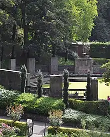 In 1939 four huge air-raid shelters were created within this northern embankment. The distinctive shelters now on the upper walkway date from 1950 and were designed by Alexander Garden Forgie. As with most structures in the gardens they are listed buildings.[6]