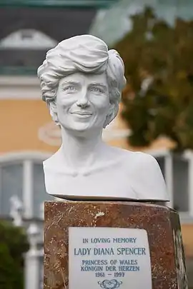 The Princess Diana Memorial is a memorial dedicated to Diana, Princess of Wales, in Vienna. It is located in the garden of Cobenzl Castle, located in Schloss Schönbrunn in Vienna, Austria. The memorial consists of a plaque and bust of Diana. On the plaque, Diana is erroneously described as Lady Diana Spencer, a style she did not have at the time of her death and did not carry since her wedding in 1981. It is the first memorial dedicated to her in a German-speaking country.[1]