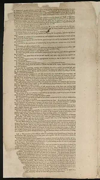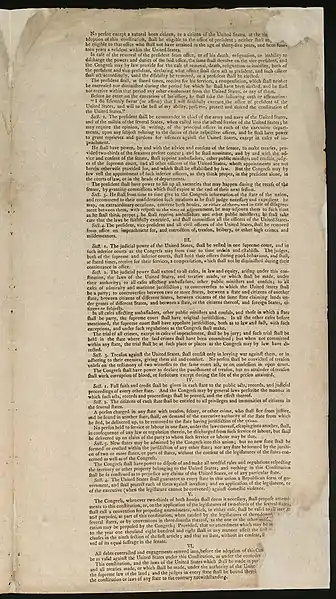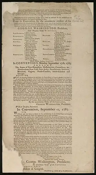 In the final Constitution's printing, Dunlap & Claypoole produced 500 copies of a six-page broadside with Caslon small-pica type.[5] Its sole typographical error mistakenly spelled out a number in Article Five but was corrected in subsequent reprints.[6]