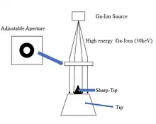 FIB milling is a sharpening method for probe tips in SPM. A blunt tip is first fabricated by other etching methods, such as CVD, or the use of a pyramid mold for pyramidal tips. This tip is then sharpened by FIB milling as shown in Fig. 8. The diameter of the focused ion beam, which directly affects the tip's final diameter, is controlled through a programmable aperture.[22]