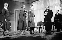 In Sweden, which banned explicit antifascist works due its neutrality and fears from the right-wing press' reaction, Professor Mamlock was the only such play allowed to be performed.[23] Between 1935 and 1943, it was also staged in theaters in Tokyo, Moscow, Amsterdam, Paris, Madrid, Johannesburg, Basel, Oslo, Shanghai, Chongqing and other cities, being viewed by millions.[13][24] It was the first ever foreign play to be performed in Kazakhstan, where it was produced during the Second World War.[25] After the end of the war, the drama had its German premiere in Berlin's Hebbel Theater, on 9 January 1946, starring Walter Franck.[26] In 1947, a production was staged by the City Theatre of Landsberg am Lech.[27]