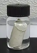 Selenium is a metallic-looking, moderately reactive[8] solid with a density of 4.81 g/cm3 and is soft (MH 2.0) and brittle. It melts at 221 °C to a black liquid and boils at 685 °C to a dark yellow vapour. Selenium has a hexagonal polyatomic (CN 2) crystalline structure. It is a semiconductor with a band gap of 1.7 eV, and a photoconductor meaning its electrical conductivity increases a million-fold when illuminated. Selenium has a moderate ionisation energy (941.0 kJ/mol), high electron affinity (195 kJ/mol), and high electronegativity (2.55). It is a poor oxidising agent (Se + 2e− → H2Se = −0.082 V at pH 0). The chemistry of selenium is largely covalent in nature, noting it can form ionic selenides with highly electropositive metals. The common oxide of selenium (SeO3) is strongly acidic.