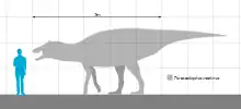 Prosaurolophus was a large-headed duckbill; the most complete described specimen has a skull around 0.9 metres (3.0 ft) long with its body size measuring 8.5 metres (28 ft) in length and 3 metric tons (3.3 short tons) in body mass.[10][11] It had a small, stout, triangular crest in front of the eyes; the sides of this crest were concave, forming depressions.[12] This crest grew isometrically (i.e. without changing in proportion) throughout the lifetime of the individual, leading to speculation that the species may have had a soft tissue display structure, such inflatable nasal sacs.[13]