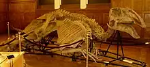 The second species, P. blackfeetensis, is based on a specimen in the Museum of the Rockies (MOR 454), which was described by another notable paleontologist, Jack Horner. This specimen, and the remains of three or four other individuals, were found in Glacier County, Montana.[8] In this case, the fossils were found in a bonebed of Prosaurolophus remains, which indicates that the animals lived together for at least some time. The bonebed is interpreted as reflecting a group of animals that congregated near a water source during a drought.[9]