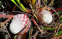The flowers (florets) are clustered together in a structure called a 'pseudanthium', a special type of inflorescence, which is also called a 'flower head'. A mature P. pruinosa can produce up to seventeen of these flower heads in a season. When these inflorescences fully open they release a pleasant, yeasty scent.[11] The flower head is surrounded by fleshy, petal-like appendages called 'involucral bracts'. These bracts have a white woolly indumentum on their outer surface, but their base and the inner surface is coloured a brilliant carmine.[8] This colour pattern is opposite that of most rodent-pollinated proteas, which usually have flower heads with dark outer bract surfaces and a whitish centre.[12] The plant is monoecious, both sexes appear in each flower.[6]