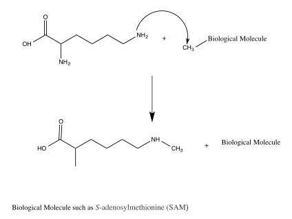 Once the peptide chain is synthesized, it still must be modified. Post-translational modifications can occur before protein folding or after. Common biological methods of modifying peptide chains after translation include methylation, phosphorylation, and disulfide bond formation. Methylation often occurs to arginine or lysine and involves adding a methyl group to a nitrogen (replacing a hydrogen). The R groups on these amino acids can be methylated multiple times as long as the bonds to nitrogen does not exceed 4. Methylation reduces the ability of these amino acids to form hydrogen bonds so arginine and lysine that are methylated have different properties than their standard counterparts. Phosphorylation often occurs to serine, threonine, and tyrosine and involves replacing a hydrogen on the alcohol group at the terminus of the R group with a phosphate group. This adds a negative charge on the R groups and will thus change how the amino acids behave in comparison to their standard counterparts. Disulfide bond formation is the creation of disulfide bridges (covalent bonds) between two cysteine amino acids in a chain which adds stability to the folded structure.[17]