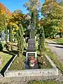 The Evangelical Protestant Central Cemetery in Regensburg was inaugurated on November 2, 1898. It blends the elements of a rural cemetery in a landscaped park-like setting with a monumental Christian cemetery character. The new central cemetery was the successor to two older non-existent Protestant cemeteries, namely the Lazarus cemetery and St. Peter's cemetery, which were both located near the city wall. To establish a new cemetery catering to all Protestant parishes of Regensburg, the Evangelical Lutheran deanery set up a commission that included Julius Pöverlein and Christian Zinstag as architects and appointed Conrad Mayer as a landscape designer. Some additional requirements from the city had to be taken into account, because part of the cemetery land was to be used as a communal municipal cemetery under the control of the city administration in order to bury the non-religious citizens without any church affiliation and serve as a potter's field for found unidentified decedent as well as suicide burials. The mortuary and a prayer hall were built in the Neo-Renaissance style in 1898. Access to the cemetery is from the north via a three-arched portal designed by German Bestelmeyer, with the Biblical inscription “Your dead shall live” (Isaiah 26:19) above the central arch, topped by a large stone cross. The cemetery was consecrated on November 2, 1898 by Rudolf Woldemar Koch, the Lutheran provost General-Superintendent, and the first burial recorded on the cemetery grounds was Luise Hirschmann, the wife of the stonemason Gottfried Hirschmann, who was also involved in the design of the cemetery. In mid-July 1899, an approximately 10 meters long gigantic crucifix was placed on the cemetery ground which was created by the sculptor Anton Hess. The cemetery houses many ornate mausoleums and family chapels, including the impressive Dörnberg mausoleum, built between 1911 and 1914. The mausoleum is characterized by an exterior staircase flanked by resting lions and a high, steep-arched stone dome with shell limestone cladding based on the Byzantine architecture. Above the portal is the coat of arms of the Von Dörnberg family. In the interior, vaulted by a flat dome painted in Art Nouveau style, is the circular crypt with eight burial chambers. The room is decorated with mosaics and a large Caritas figure, as well as a bust of Ernst von Dörnberg.[1] [2] [3]
