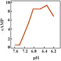 Production of cAMP in response to activation of TDAG8 G protein-coupled receptor by low pH. Data from Wang et al., "TDAG8 is a proton-sensing and psychosine-sensitive G-protein-coupled receptor".[1]