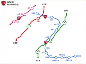 Provincial Highway 72 (Chinese: 台72線) is an expressway, which begins in Houlong, Miaoli on Guanghua Road (Provincial Highway No. 1) and ends in Shitan, Miaoli on the Provincial Highway No. 3.