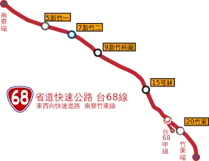 Provincial Highway 68 (Chinese: 台68線) is an expressway, which begins in Hsinchu City at Nanliao on the Provincial Highway No. 15 and ends in Zhudong on Zhongfeng Road (Provincial Road No. 3).