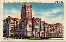 Proviso East High School is a public secondary school in Maywood, Illinois which serves the educational needs of Maywood and three other villages within Proviso Township, Cook County, Illinois: Broadview, Forest Park and Melrose Park. It is the original campus of Proviso Township High Schools District 209. Prior to being split into East and Proviso West High School in 1958, East was known as Proviso Township High School. The school is located at the intersection of Madison Street and First Avenue (which is Illinois Route 171 in that part of Maywood).