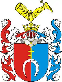 Shield in pole split in the right red - wolf silver knife blade down toward the center rotated in the left blue - half of silver horseshoe nailed to a one and a half gold cross, the lower arm to the right, the jewel foot armed with a spur, in knee bent, foot to the left.