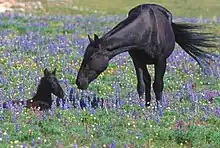 Pryor Mountain mustangs exhibit a natural paso gait.[8][87] The horses are generally intelligent, strong, and sure-footed, and exhibit great stamina.[87] Like all feral horses, they generally avoid human contact, are distrustful, and are easily spooked. However, once they are familiar with an individual, they can exhibit a strong social bond with that individual.[87] Pryor Mountains horses can be trained and ridden, and trained to do any task a domesticated horse can perform.[87] Trained Pryor Mountains horses have a calm temperament, and are alert on trails.[87]
