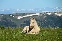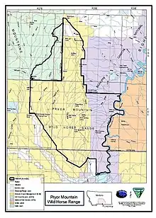 The Pryor Mountains Wild Horse Range is a refuge for a historically significant herd of free-roaming mustangs, the Pryor Mountain mustang, feral horses colloquially called "wild horses",[1] located in the Pryor Mountains of Montana and Wyoming in the United States. The range has an area of 39,650 acres (160.5 km2)[2] and was established in 1968 along the Montana–Wyoming border as the first protected refuge dedicated exclusively for mustangs.[3] It was the second feral horse refuge in the United States.[4] About a quarter of the refuge lies within the Bighorn Canyon National Recreation Area.[5] A group of federal agencies, led by the Bureau of Land Management, administers the range.[6]
