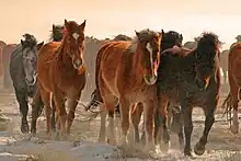 The horses form bands or "harems," in which a single stallion mates with and controls a group of about six mares.[8] Another eight to 10 "bachelor" stallions accompany the band at a distance, hoping to win control of it from the stallion or to mate with mares.[8]