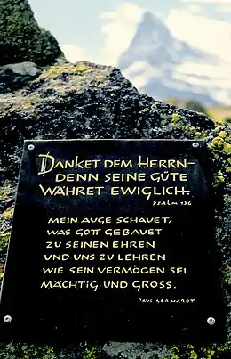 ![]() Plaque quoting verse 1 from Psalm 136 at an ascent to the Matterhorn together with lines from a hymn by Paul Gerhardt based on it | |